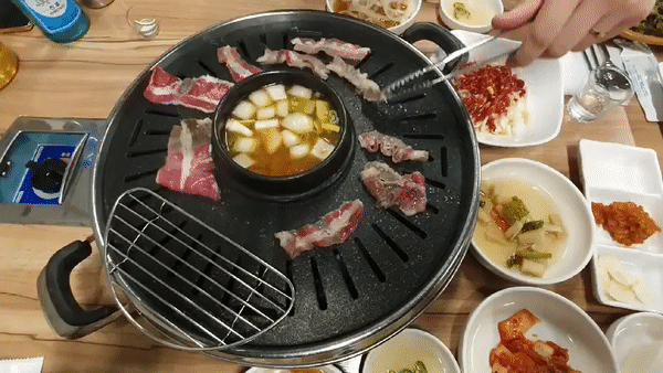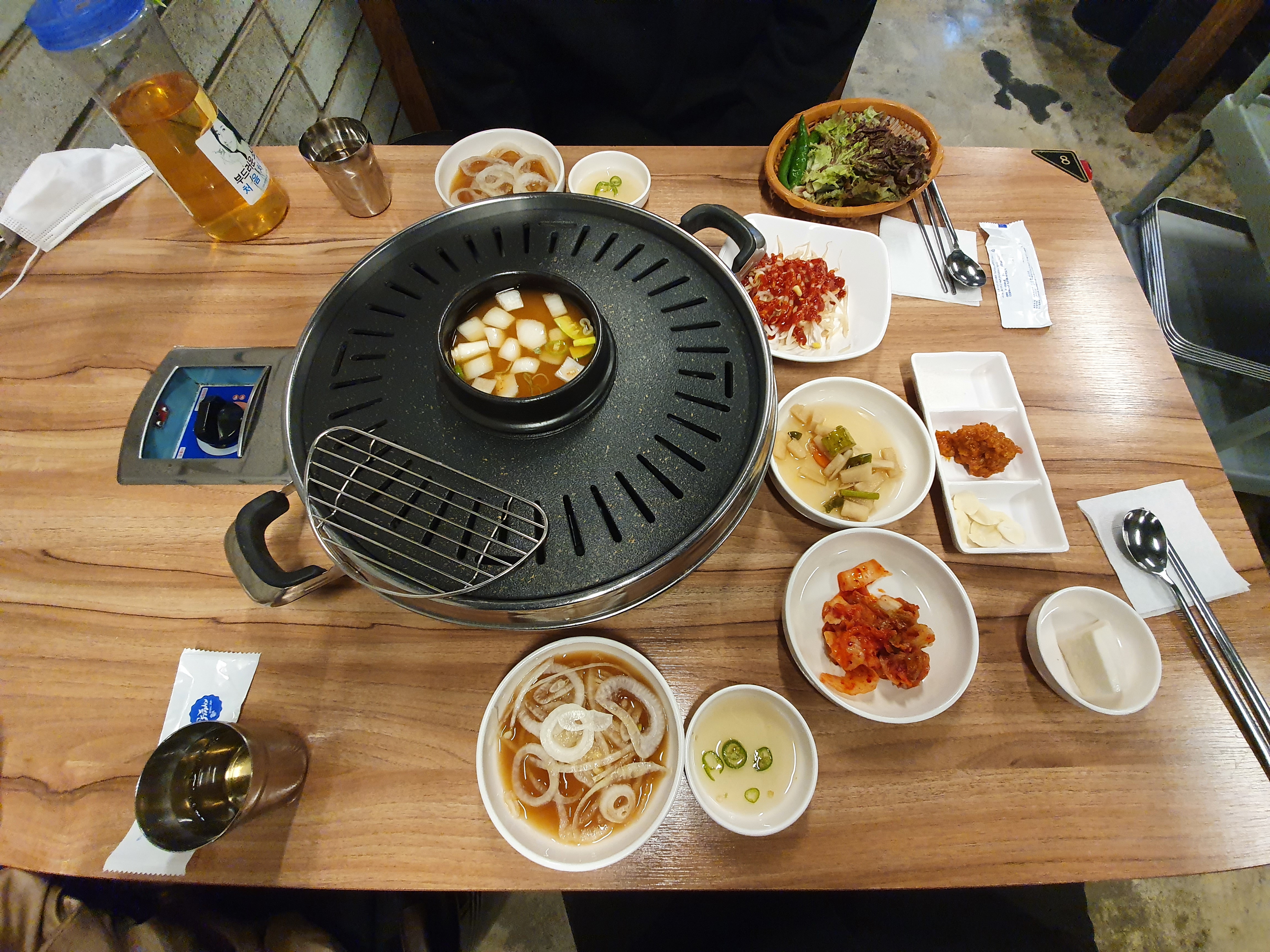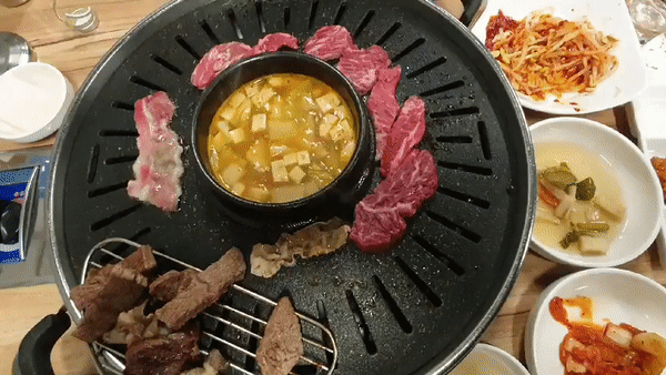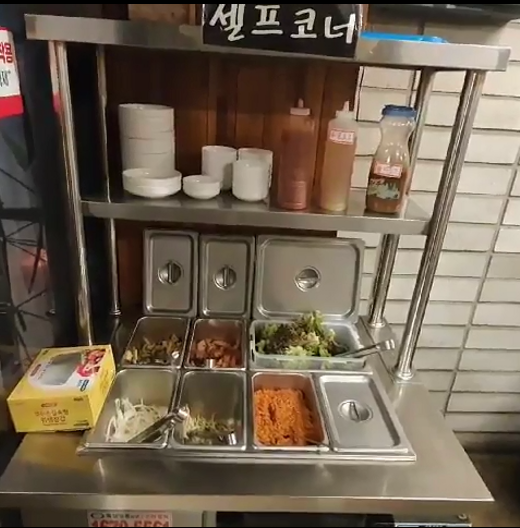 상차림은 소고기 찍어먹는 전용 소스와, 양파절임, 김치, 무절임, 소금, 쌈장, 마늘, 쌈채소 등이 있고, 불판 닦는 용으로 쓰는 무가 있음. 입구쪽에 셀프코너가 있어서 필요한 것들 추가적으로 가져다 먹을 수 있음.