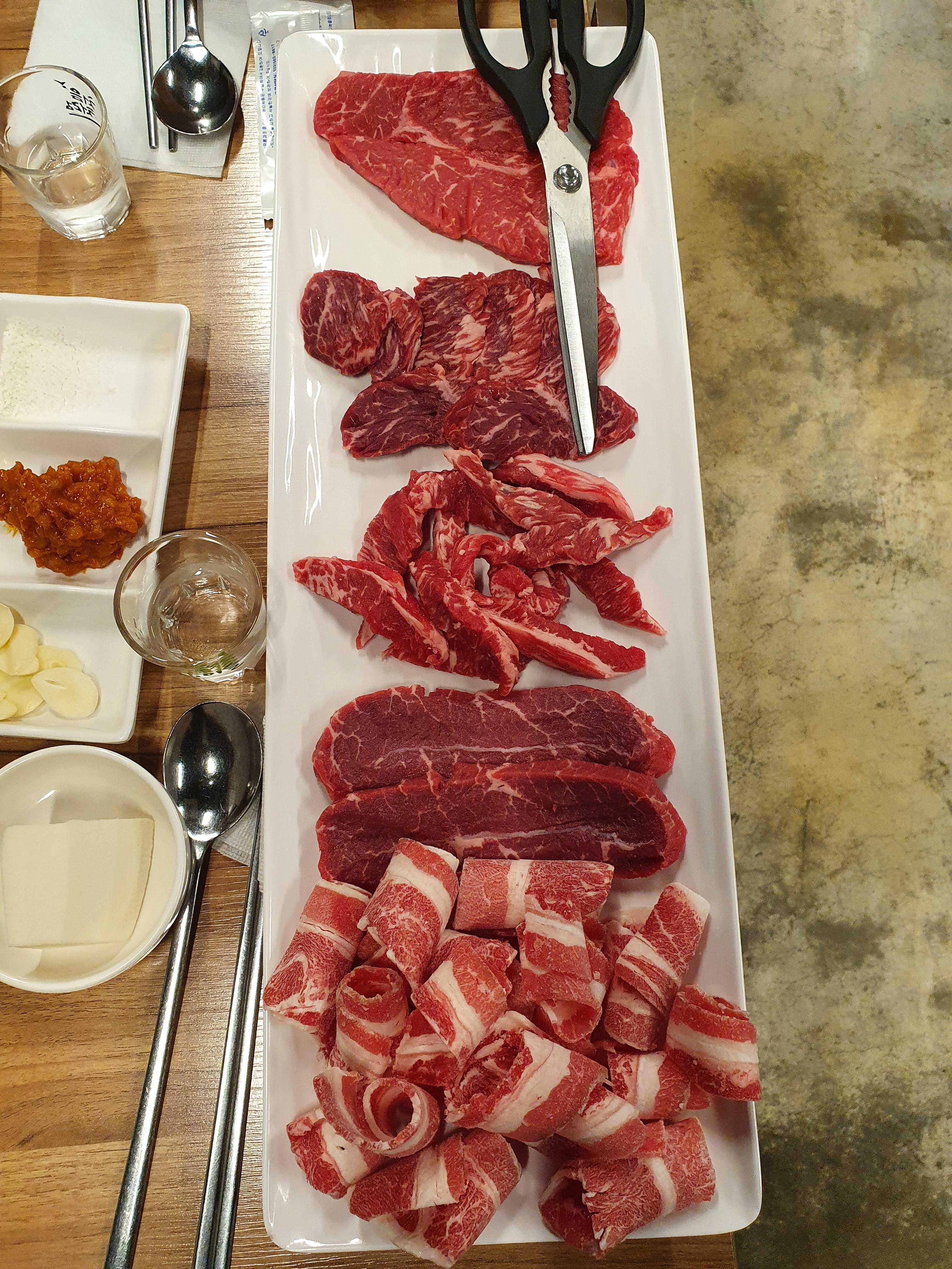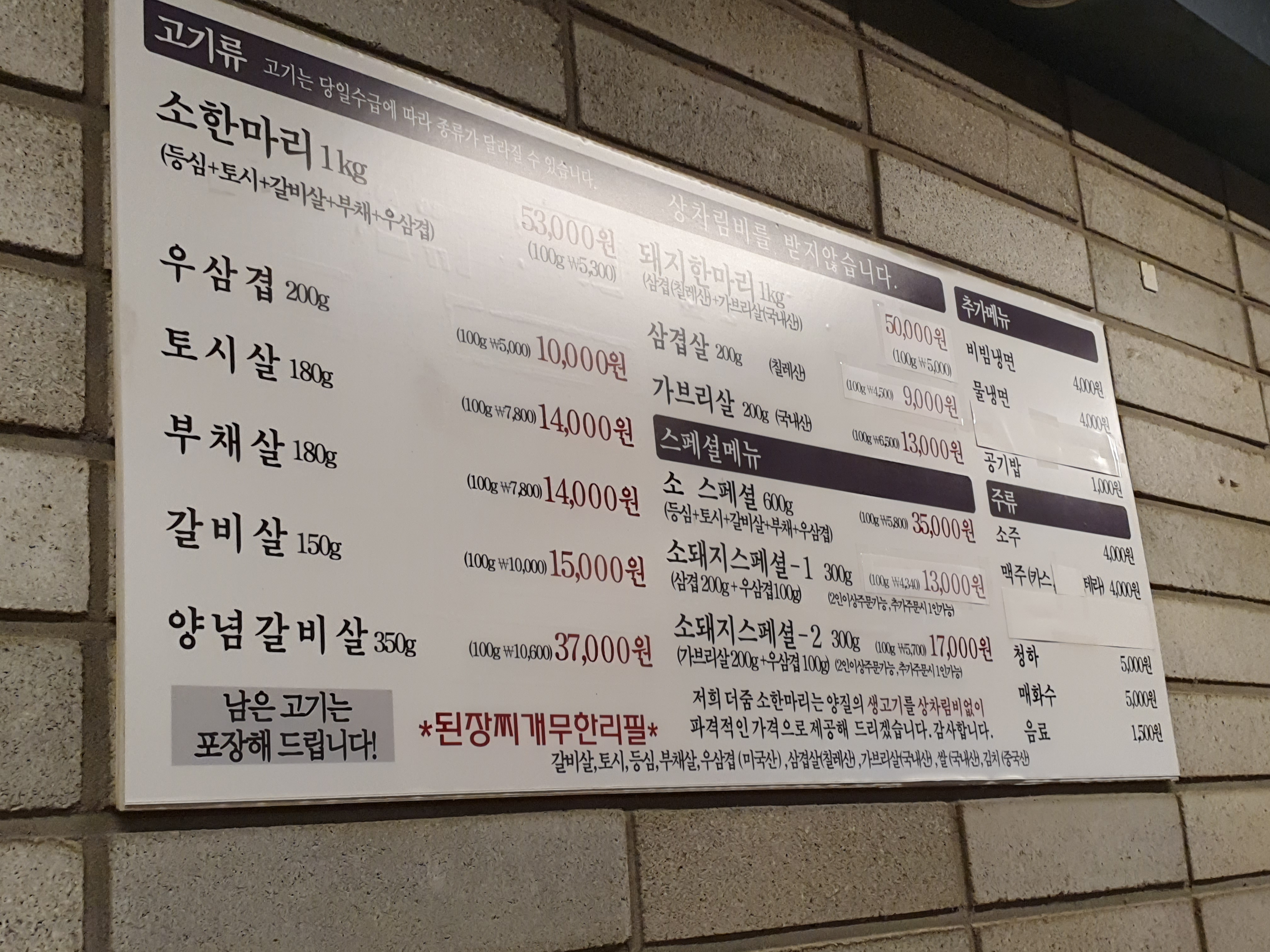 메뉴는 주력으로 소한마리, 돼지한마리가 있고, 다양한 특수부위 추가해서 먹을 수 있음. 보통 남자 셋이가면 1kg, 둘이가면 스페셜로 먹었음. 이날은 소 스페셜로 먹었음