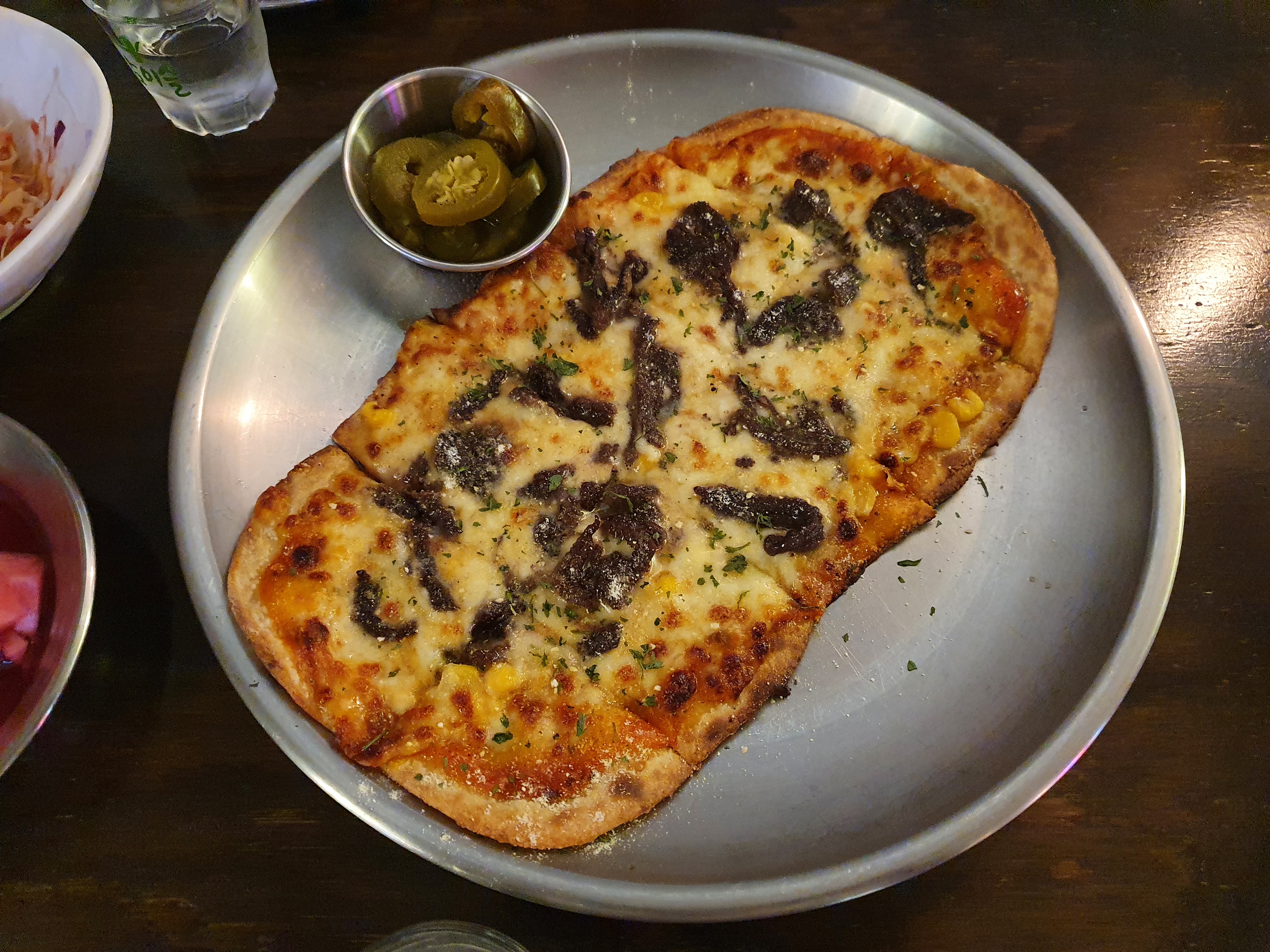 우리는 마늘을 사랑하니까 두번째 방문때도 마늘이 올라간 치킨이었던거 같은데, 이건 수비드가 아니라 튀긴 치킨이었음. 정보를 제대로 알려드리고싶어 메뉴판을 검색해봤지만 정확히 어떤거였는지 기억이 잘 안난다..ㅠㅠ 피자는 그냥 불고기피자였던 것으로 기억한다. 피자도 사각형으로 잘려있어서 한입에 먹기 좋았고, 치킨도 역시나 맛있었다.