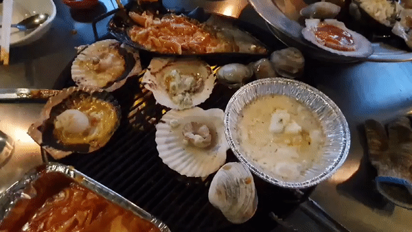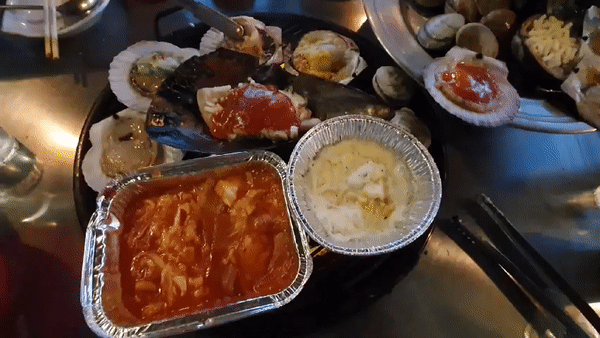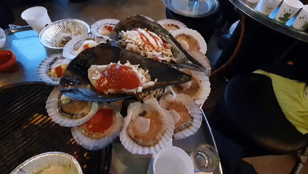 우리는 양념조개구이(반반 : 기본, 양념) 중짜(2인용)로 시켰음. 아래와 같이 키조개 2개와 가리비 여러개 가리비 밑에 조그마한 조개들과 호일에 싸여있는 의문의 무언가가 있는데, 버릴뻔했다가 나중에 알고보니 오징어가 들어있었음. 불판에 올려두면 오징어를 삶은것처럼 익어서 마지막 입가심 겸 쫄깃하게 먹을 수 있음.