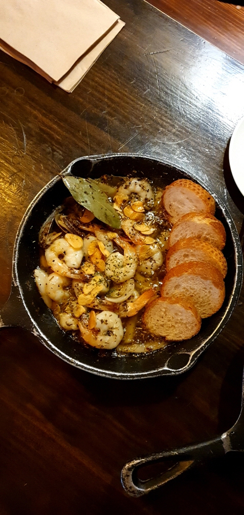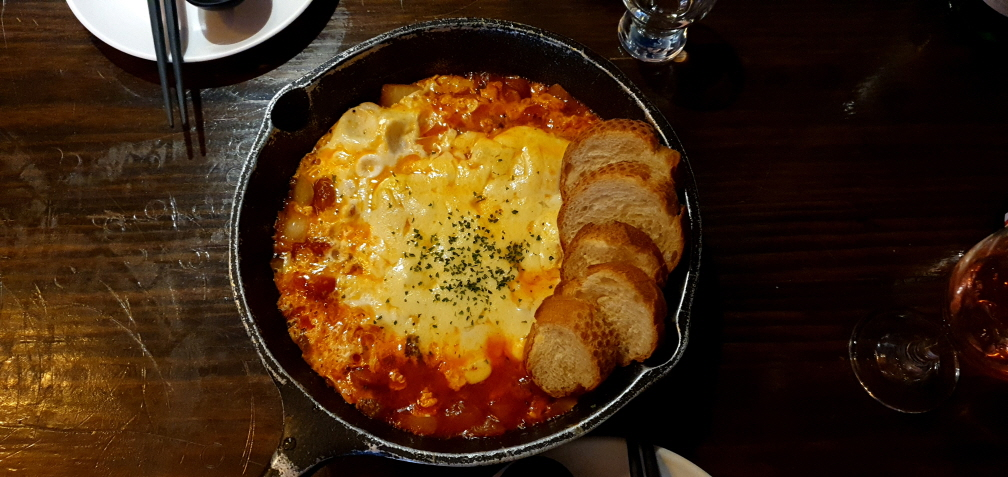 왼쪽은 메뉴판이고, 오른쪽은 감바스임. 사진으론 뭔가 커보이는데 그렇게 크진 않음. 커플끼리 먹는데 많이 모자랐음. 가격이 18000원이면 적지 않은 금액이고 감바스 만드는데 엄청 어려운 음식은 아니기에 좀 비싸다고 느껴짐.