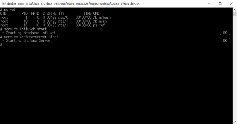 - 컨테이너 CLI에서 servce influxdb start, service grafana-server start 입력