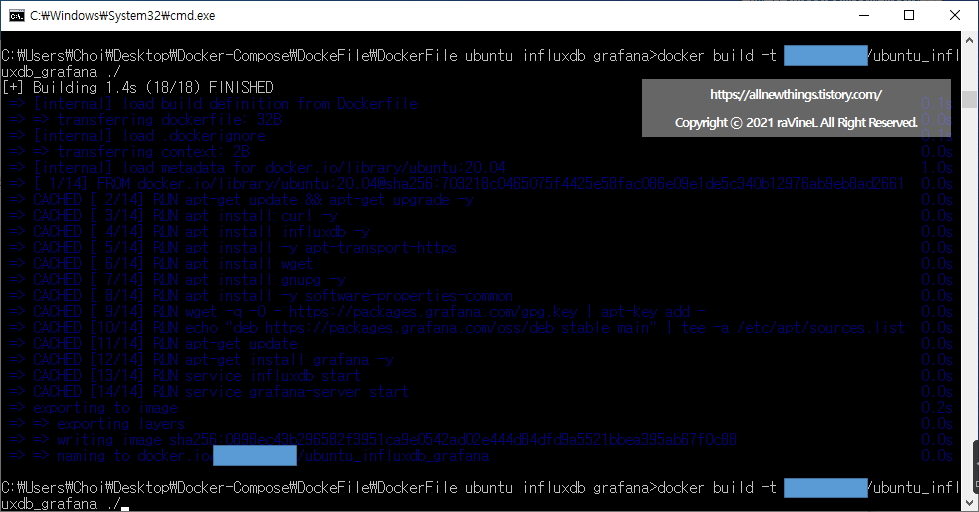 - CMD에서 Docker build –t XXX/Ubuntu_influxdb_grafana ./ 실행
