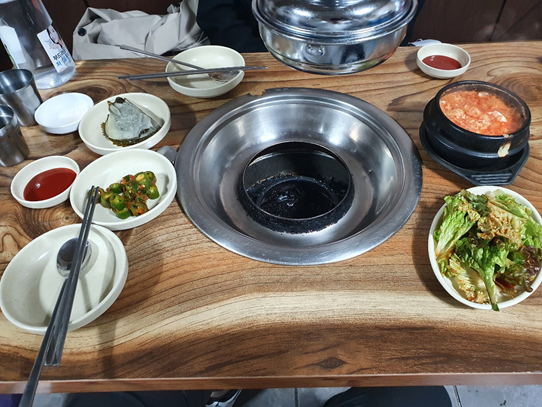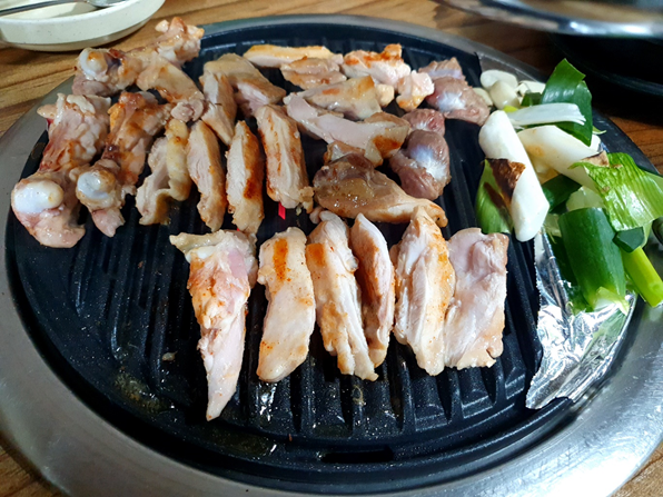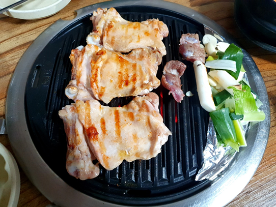 메뉴는 다양하게 있는데, 우리는 숯불닭소금구이 2인분에 1인분 추가, 냉모밀, 계란찜 이렇게 먹었다. 양념구이도 먹어보고 싶었는데, 양념때문에 불판에 굽기가 힘들 것 같아 소금구이로 먹었다. 다른 테이블은 양념구이도 많이 먹었다.