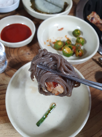 먹을 땐 밑반찬으로 나온 깻잎장아찌랑 쌈무 등이랑 같이 싸서 먹거나, 상추겉절이도 있으니 취향에 맞게 조합해서 먹으면 된다. 사이드로 모밀을 시켜 먹으면 맛난다. 다른 테이블은 닭칼국수 같은 것도 먹던데, 1차로 닭숯불구이를 먹고 2차로 따뜻하게 닭칼국수 같은거 먹으면 든든하게 먹을 수 있을 것 같다!