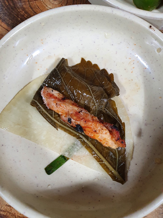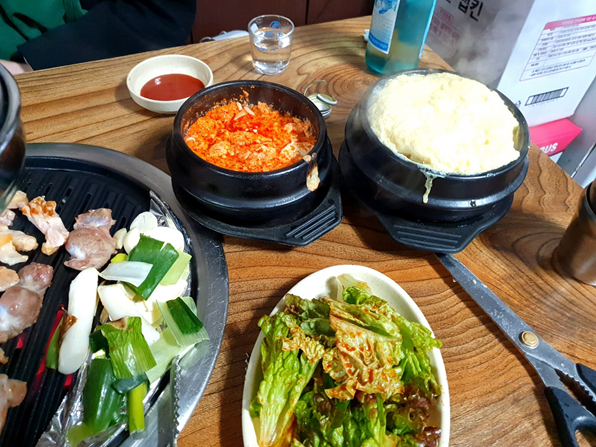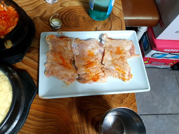 밑반찬은 순두부찌개와 상추절임, 고추무침과 깻잎장아찌, 쌈무를 준다. 소금구이의 소스는 전용소스와 소금을 주셨다. 1인분에 닭소금구이 3조각을 주는데, 각 끝에 갈비처럼 뼈가 붙어 있어서 구어서 먹을 수 있다.