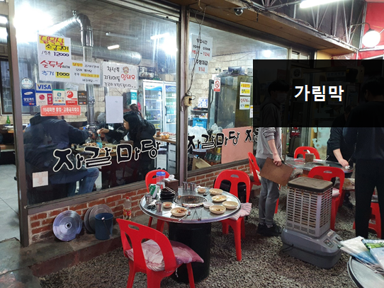 가게는 실내와 앞에 마당을 활용해서 구분되어 있는데, 아무래도 겨울이라 비닐로 바람을 막으려고 해둔 것 같다. 밖에도 4테이블이 있고 실내에 3테이블이 있다. 더 놓을 수 있는데 사회적 거리두기 때문에 테이블이 띄엄띄엄 있다.